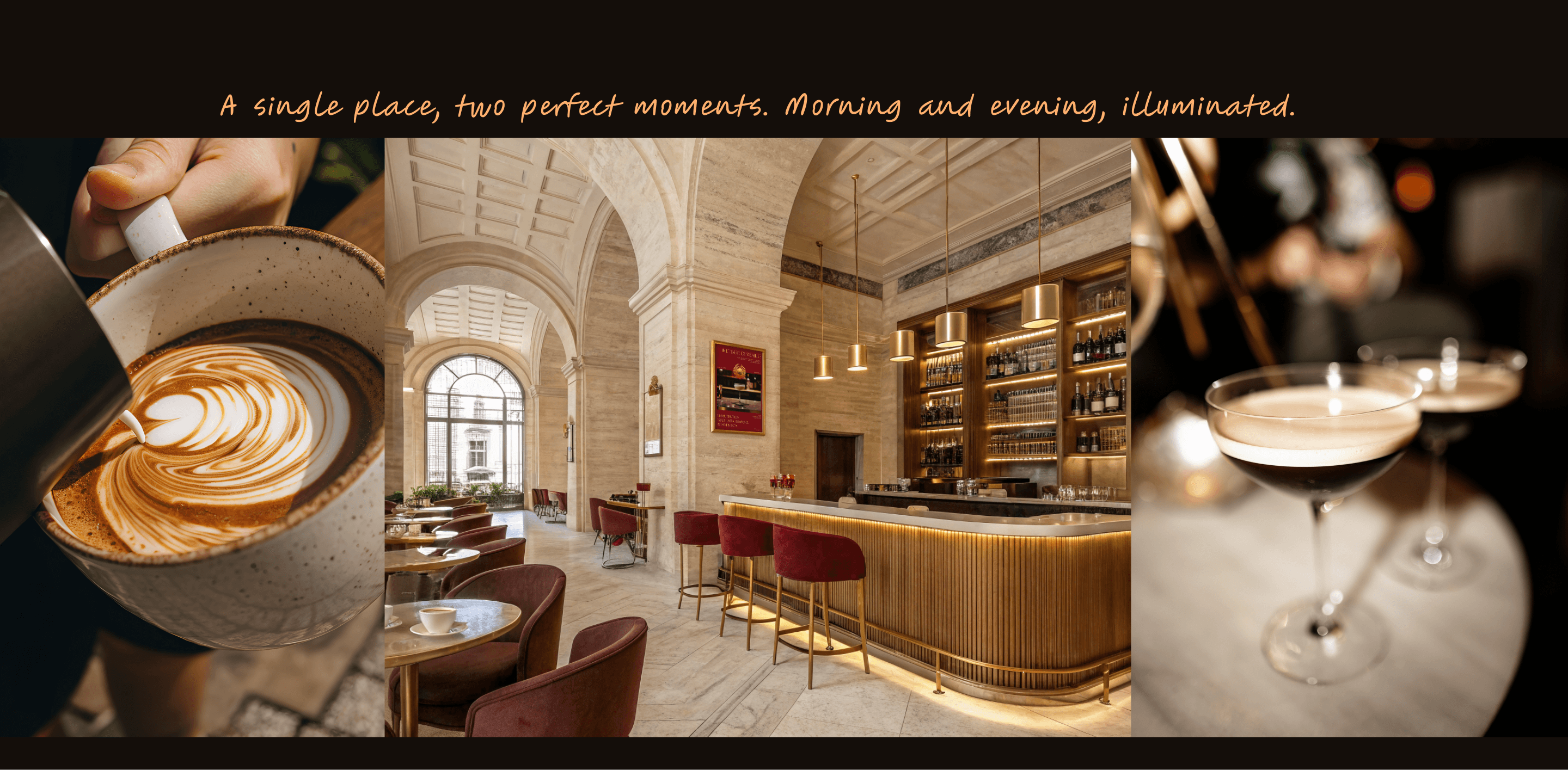 The name Lumen means light and the brand is inspired by the idea of the eternal rhythm of the city, where a single place embodies two perfect moments. From a refined morning coffee bar to a vibrant evening destination, the concept is an ode to the art of living, where light, craftsmanship, and a modern aesthetic transform every moment.